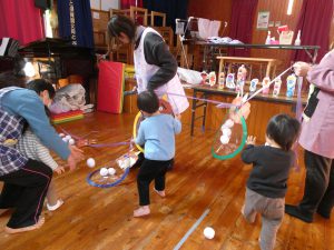 鬼の的に向かってボールを投げました😊沢山ボールを持って投げていた子どもたちです😆