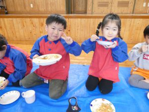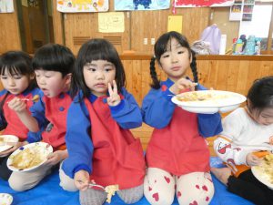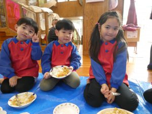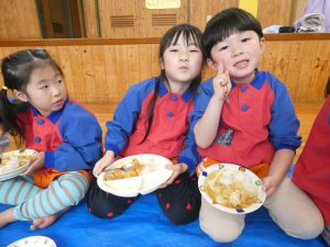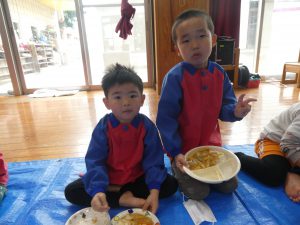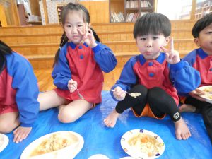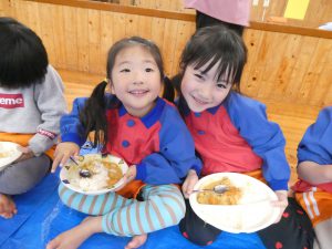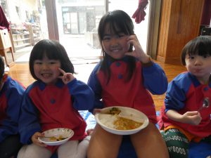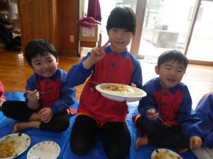 ホールでみんなで食べるカレーは美味しそうでした😊