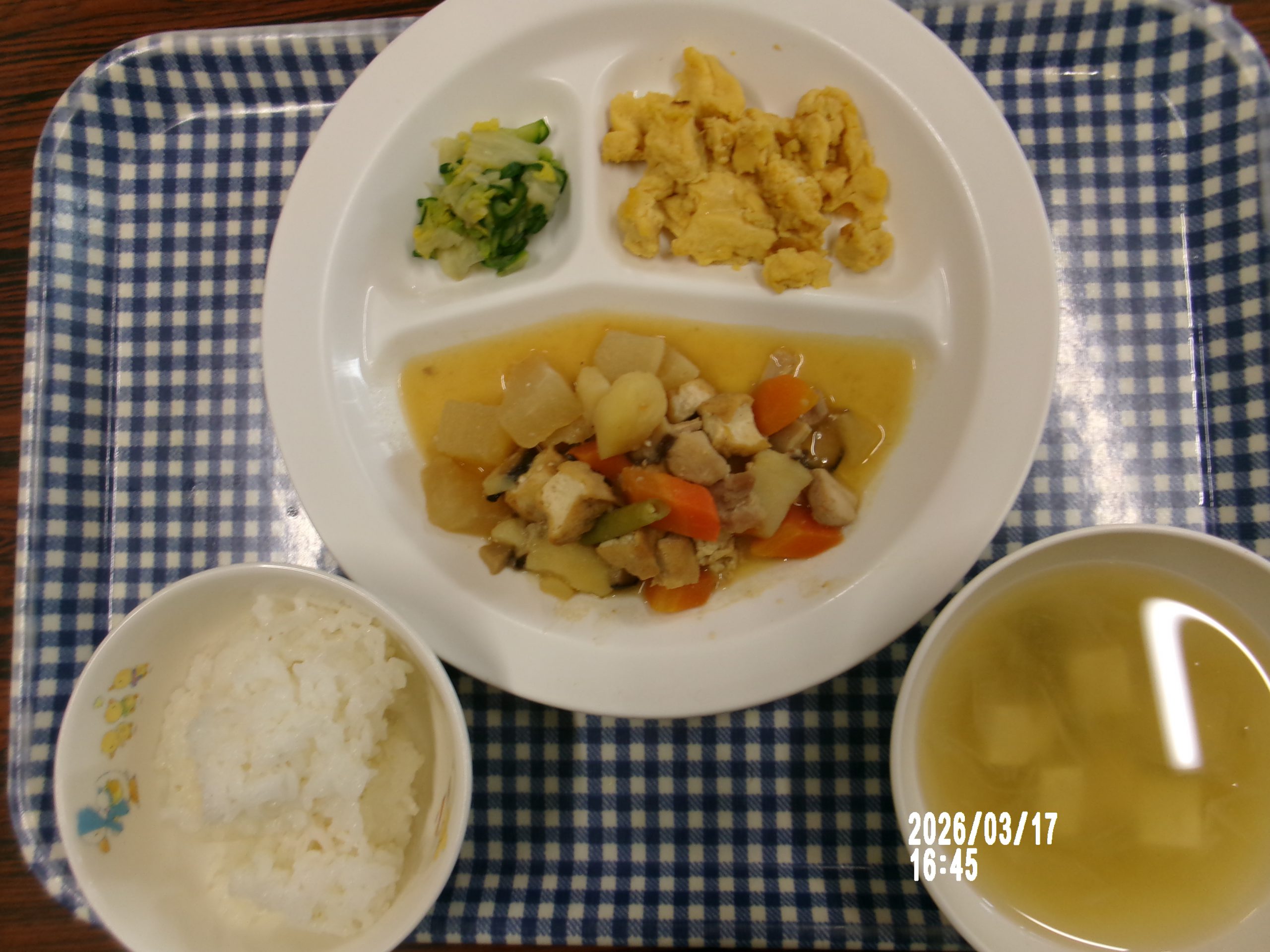 ブログ トップ ブログ 前へ »次へ »ブログ記事一覧 災害時非常食2026.03.18 3月17日 給食のごはんと根菜煮は災害時を想定し、食品用ポリ袋(耐熱性のもの)を使用し作りました。災害時、ごはんは無洗米に備蓄している飲料水を入れ袋のままゆでます。同じように煮物も切った野菜にストレートのめんつゆを入れて袋のままゆでます。どちらも30分程度でできあがります。いつもと違う味付けに戸惑うことなくどのクラスも完食でした! 前へ »次へ »ブログ記事一覧 最新の記事 散歩に行きました(いちご・めろん) 災害時非常食 交通教室 肉うどん・あくまき(給食) カレンダー <2026年3月 日 月 火 水 木 金 土 1234567 891011121314 15161718192021 22232425262728 293031